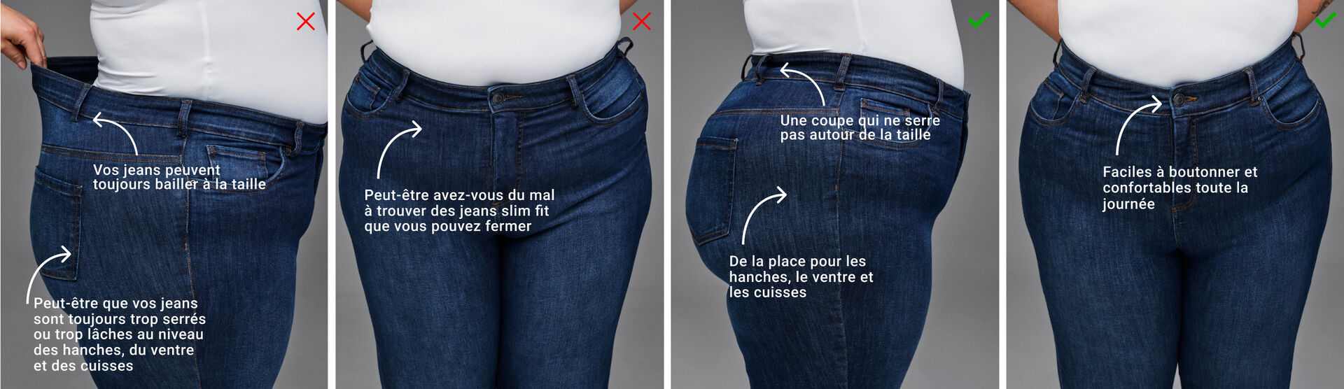 Vos jeans ne semblent-ils jamais vraiment bien vous aller ? Peut-être qu’ils baillent à la taille, qu’ils sont trop serrés ou trop lâches autour des hanches, du ventre ou des cuisses, ou que vous avez du mal à trouver des jeans slim fit que vous pouvez vraiment boutonner.